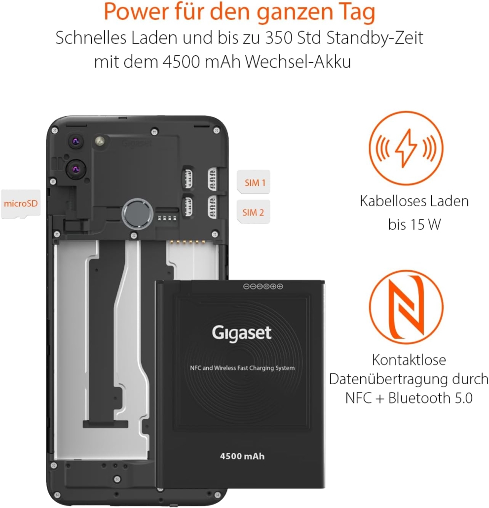 Gigaset GS5 PRO – Smartphone – 64MP Kamerasystem – 4500mAh Wechsel-Akku – 6,3″ Full HD+ V-Notch Display – gehärtete Glasrückseite – kabelloses Laden – 128GB + 6GB RAM – Android 13, grau