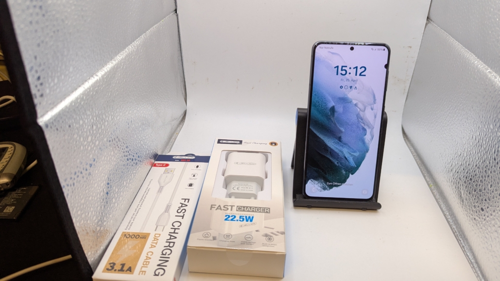 Dazu gibt es Ladekabel und Netzstecker passend zum Gerät.