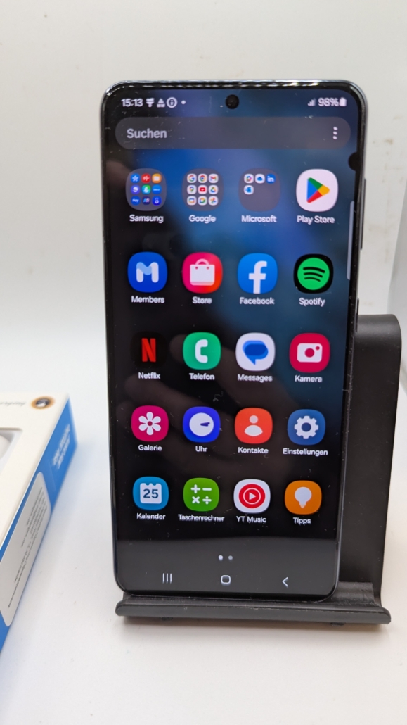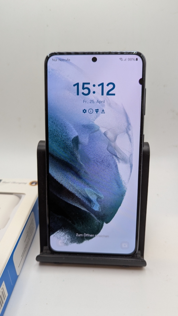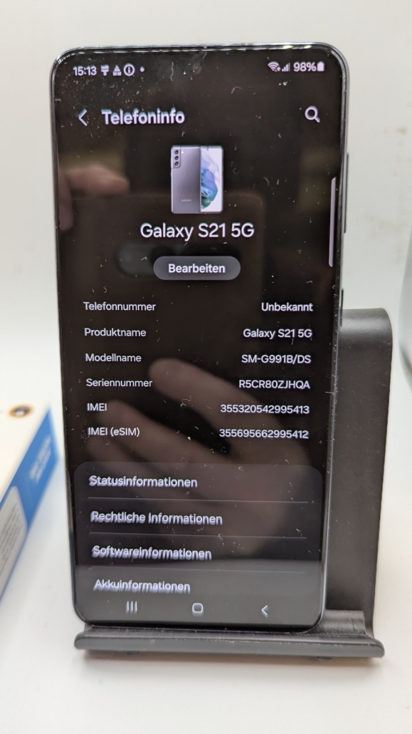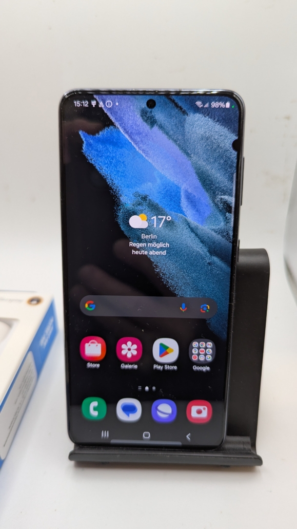 Samsung Galaxy S21 5G SM-G991B. Bildschirmdiagonale: 15,8 cm (6.2″), Display-Auflösung: 2400 x 1080 Pixel, Display-Typ: Dynamic AMOLED 2X. Prozessor-Taktfrequenz: 2,9 GHz. RAM-Kapazität: 8 GB, RAM-Typ: LPDDR5, Interne Speicherkapazität: 128 GB. Auflösung Rückkamera (numerisch): 12 MP, Rückkamera-Typ: Dreifach-Kamera. SIM-Kartensteckplätze: Dual-SIM. Installiertes Betriebssystem: Android 15. Akku-/Batteriekapazität: 4000 mAh. Produktfarbe: Grau. Gewicht: 171 g